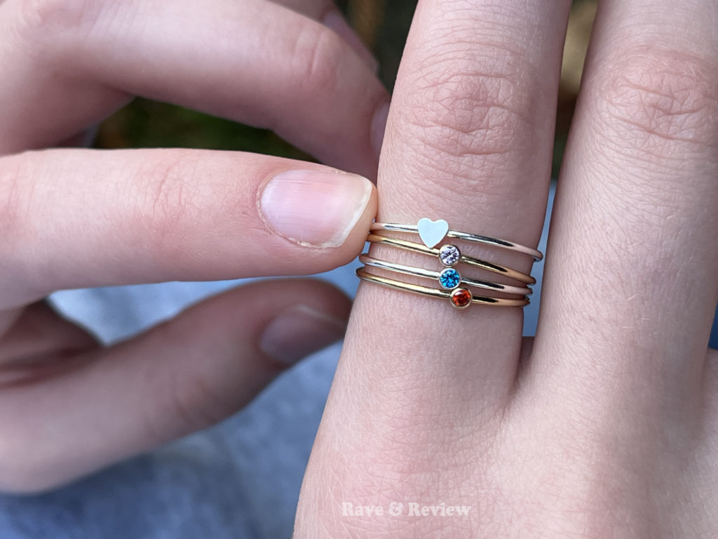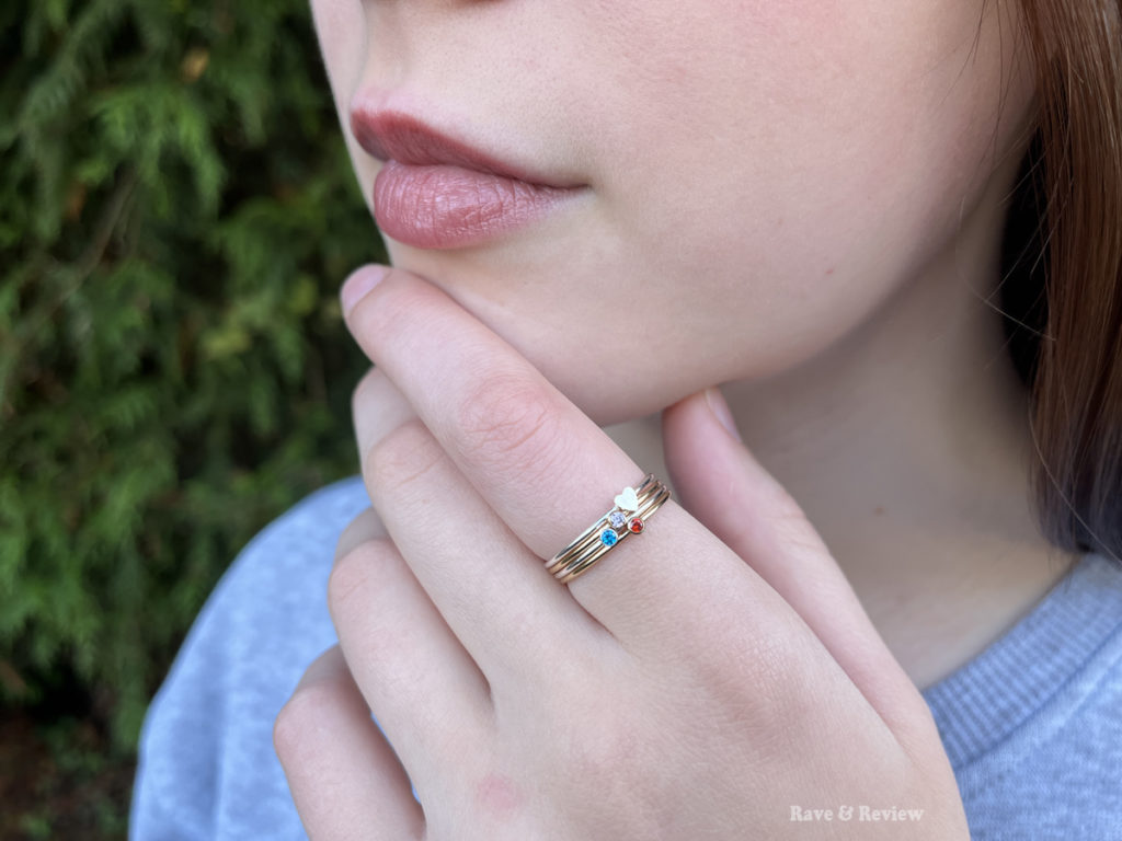 I’ve talked in the past about how much I love mother’s necklaces, and I’ve shared a few options in the past, but I have not-so-secretly always wanted a mother’s ring. I first knew of AdornablePJ for their adorable hypoallergenic earring studs that are perfect for little {and big} ears. But then I saw their adorable, dainty birthstone rings and was in love. Just look at this cuteness!