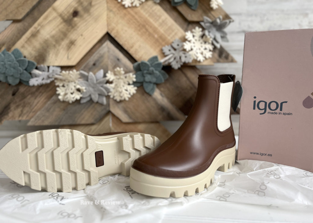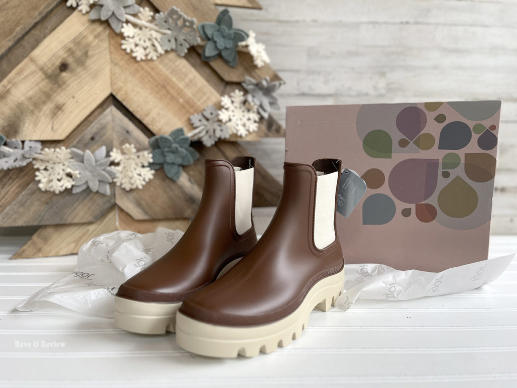 With a caramel-colored sole and chocolate upper with a nice matte finish, the igor Soul boots look good in a pumpkin patch as well as just for daily wear when rain is on the schedule. They feature elastic on the sides for an easy slip-on design and comfortable wear for all-day adventures. They come with removable comfort insoles and textile lining, and you can easily add specialty insoles if you wish. But, my favorite feature is the treads on the Soul boots that give you incredible traction in any weather. So many rain boots have nearly smooth soles, which cause you to slip and fall easily in mud and water, but the igor boots give you the ability to trek through anything.