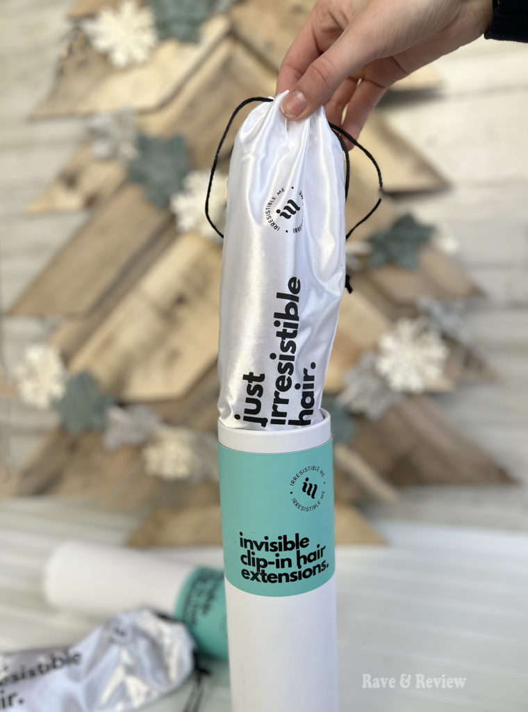 Once they arrived, I was so excited to open up the Try Me portion of the package and see it. I wasn’t exactly color matching, as I’ll be dying my hair to match the extensions instead of the other way around. Instead, I was just playing with it and seeing how to attach them. I read up on the Irresistible Me site and saw that they recommend teasing your hair before clipping, and refreshing the extensions with dry shampoo when needed. Then, when you take them off {which I love – I could never do permanent options} you simply store them in the silk bag that they arrive in.