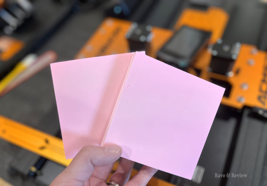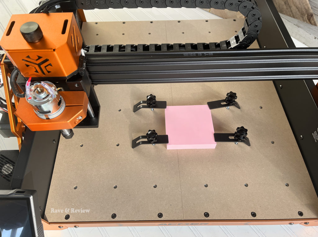 I was really excited to see that ACMER had included two test blocks so we could clamp them down and start carving the day it arrived. Nothing makes me more excited than getting started on a project immediately and not having to run out for supplies while you’re still learning a new skill, so seeing these bright pink blocks included made me giddy with excitement – the carver would be creating in no time!