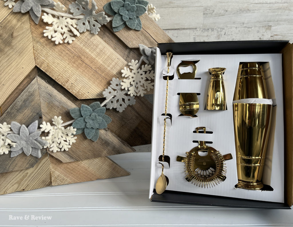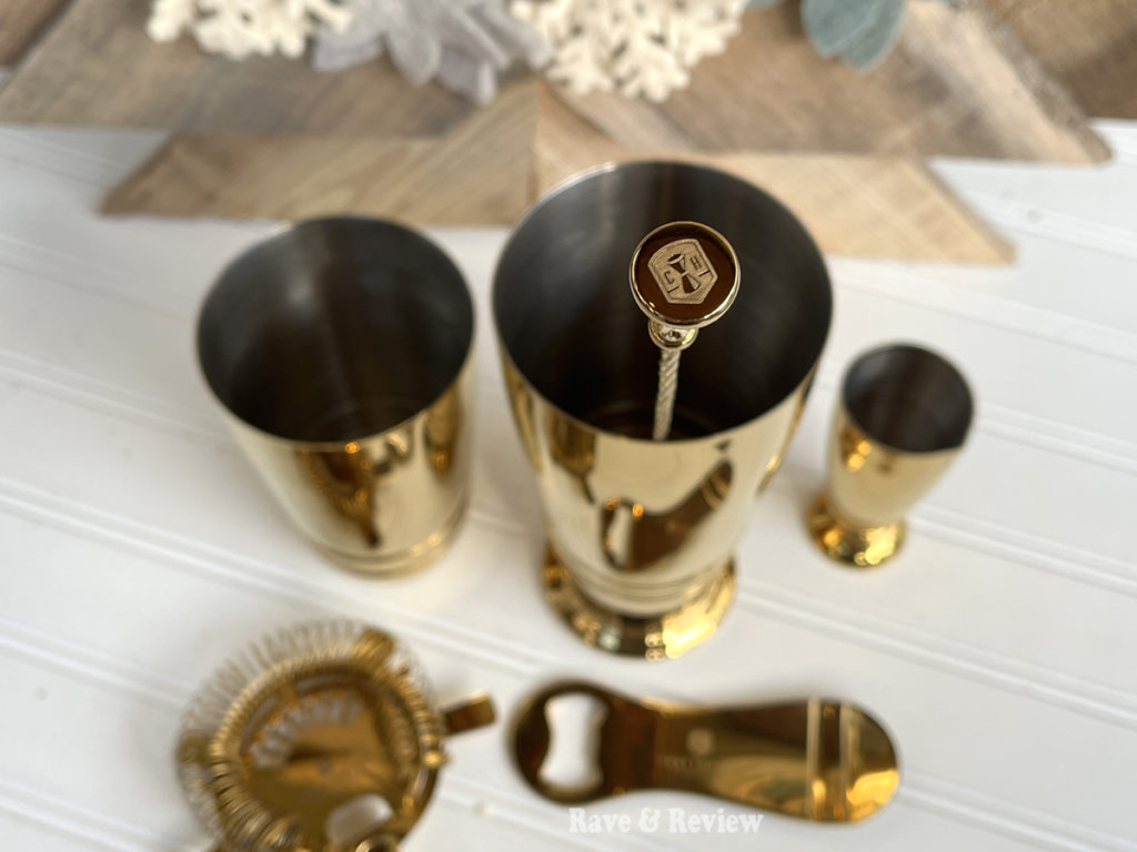 The Signature Collection Gold Bartender Essentials Set includes a 2pc cocktail shaker, a strainer, a measurement jigger, bottle opener and a mixing spoon in gold. We’ve had a Fortessa cocktail shaker for over 15 years now and love it for its functionality but always wished it was gold and had matching accessories so we could leave it displayed in our kitchen. This Bartenders Essentials Kit is the perfect addition to our cocktail shelf, for just the right amount of fancy for our every day.