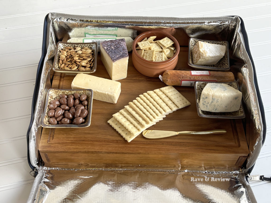 Instead of having to arrive at your destination and then spend 15-20 minutes setting up your board, you can design your charcuterie at home, add ice, and then place easily in the carrier by unzipping the side panel and sliding it in instead of having to lift it and drop it into the tote. Zip it up and you’re ready to go. There’s a clear plastic panel that you can use to peek at your board on the go, and the rest of the carrier is insulated to keep your ingredients chilled and contained for the journey.
