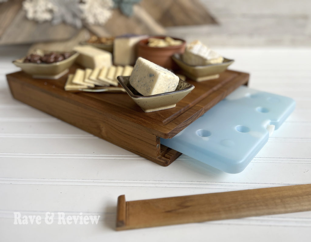 The design of the Latitude Board is genius – it’s a hollow teak wooden serving platter that has disguised wooden panels that slide off on either end to insert a large ice pack. You simply freeze the ice pack, slide one of the magnetic panels of the side and place the ice pack inside. Then you slide the side cover back in place, so the ice pack is completely hidden. To everyone else, your charcuterie board will look like a beautiful display of fruits, meat, vegetables, and cheese, but you will know that you’re serving them well chilled and at safer temperatures.