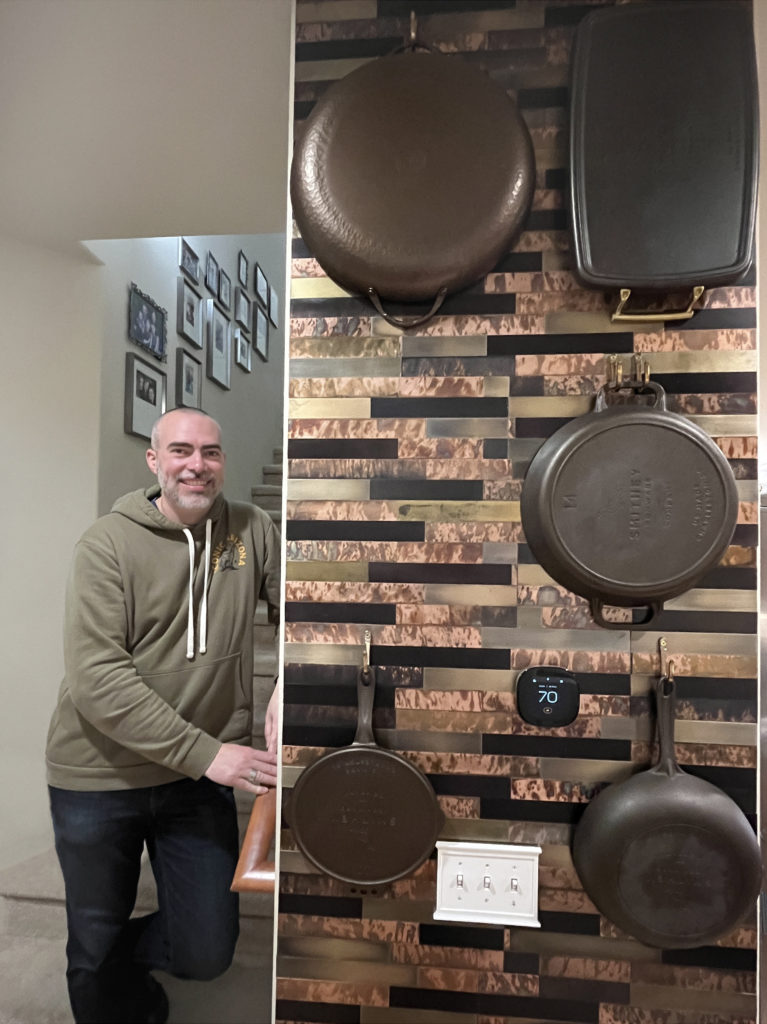 Just look at my new copper wall for displaying all of my beloved Smithey Ironworks pans. This wall was almost 6 months in the making, but it was so incredibly worth it. My husband started working on the wall last year, drawing out the plans and then right after Christmas he had some time to work on it. It was quite the labor of love since he wanted to make sure the wall and hooks could support the weight of the Smithey pans.